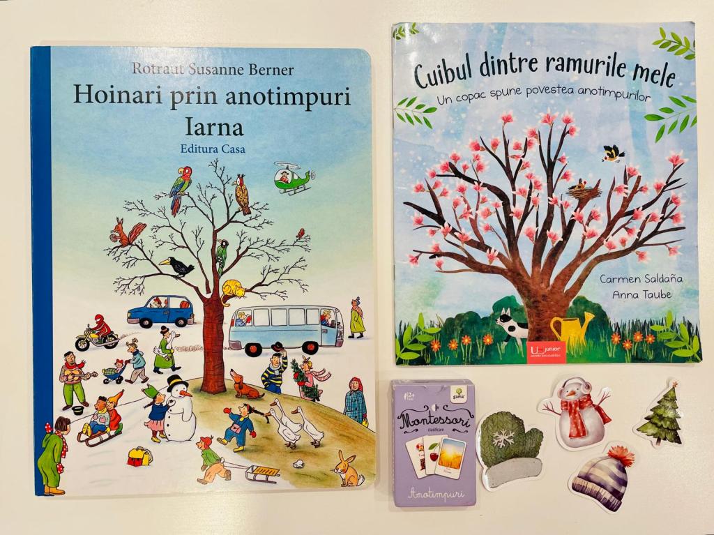 De asemenea explorăm elementele fiecărui anotimp având la îndemână seria de cărți Hoinari prin anotimpuri de la editura Casa, precum și prin povestea Cuibul dintre ramurile mele – Un copac spune povestea anotimpurilor de la editura Univers Enciclopedic.
