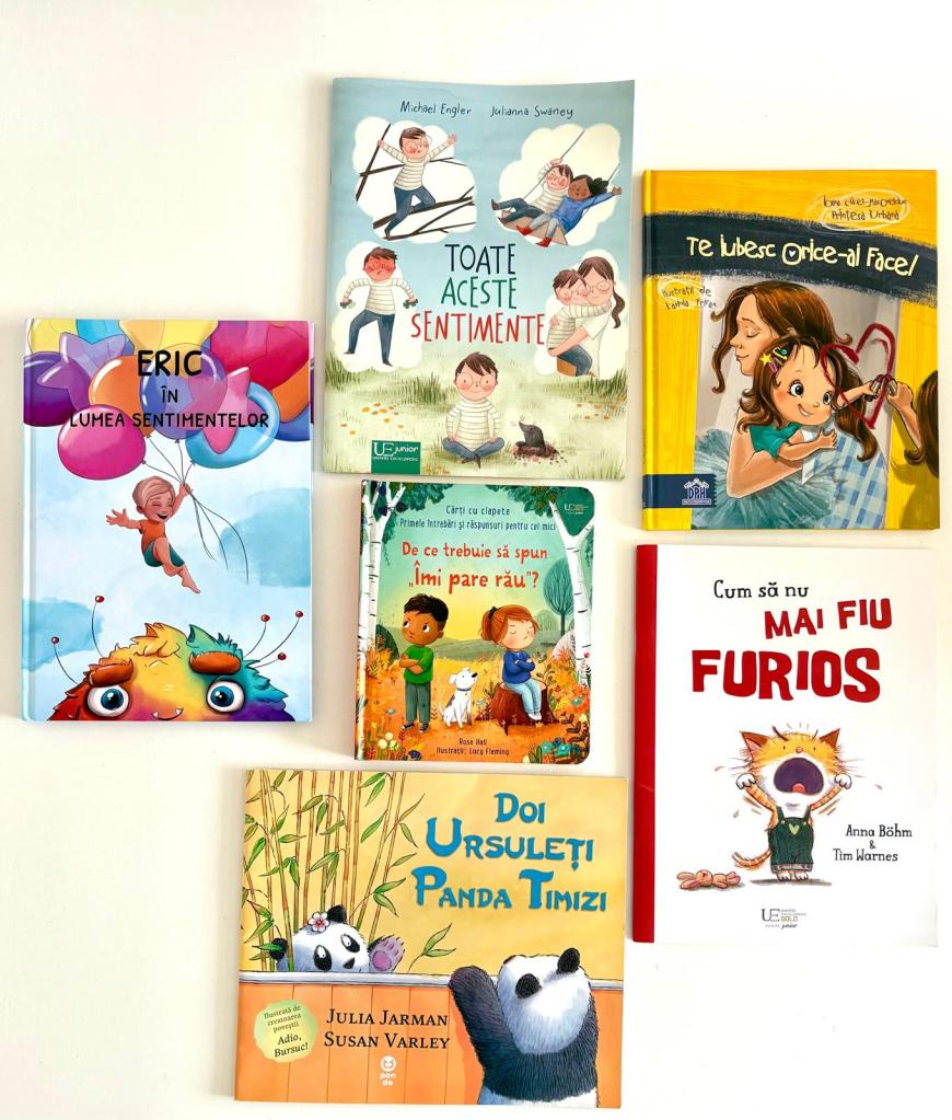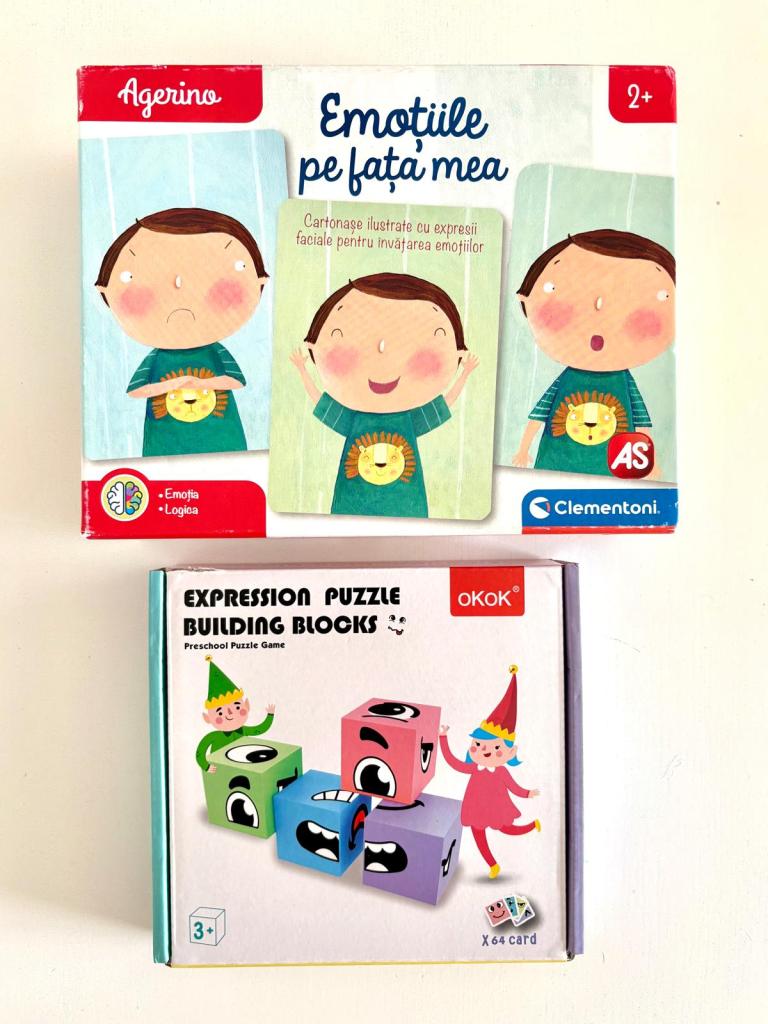Pe lângă exercițiul pe care l-am descris mai sus, care nu este legat neapărat de luna aceasta, ci face parte din rutina noastră constantă, indiferent de perioada anului, am ales din nou cărți, jocuri și jucării care să ne sprijine în acest proces continuu de învățare a emoțiilor. Acestea sunt instrumente care ne ajută să aprofundăm înțelegerea și exprimarea sentimentelor, iar în continuare vreau să le împărtășesc cu voi, explicându-le pe scurt în câteva cuvinte.